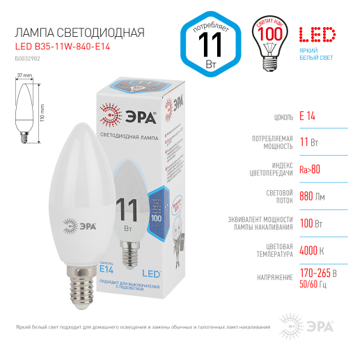 - Лампа светодиодная ЭРА STD LED B35-11W-840-E14 11Вт свеча нейтральный белый свeт Е14